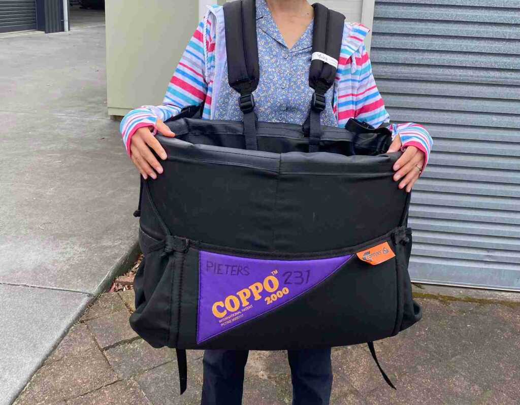 - 首と腰への負担: 常に上を見上げての作業になるため、首が痛くなります。また、カンガルーバッグ(収穫袋)にキウイが溜まると20kg近くになり、それを背負って歩くため体力が必要です。