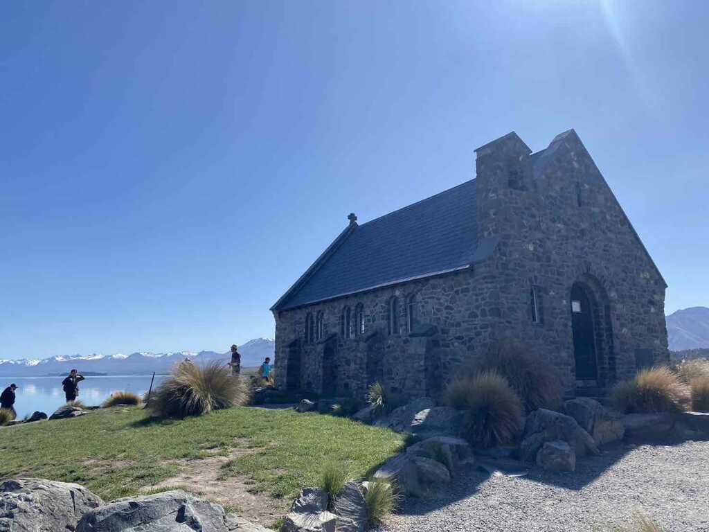 湖畔のシンボルといえば、石造りの小さな「善き羊飼いの教会(The Church of the Good Shepherd)」。背景には青い湖、夜には無数の星。