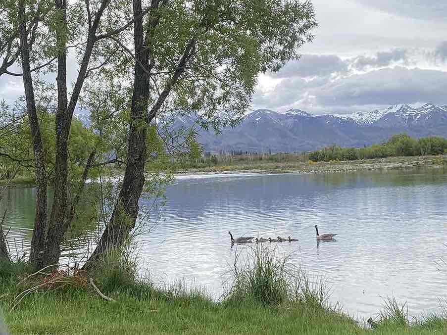 晴れた日には、遠くにマウントクックの山並みが見え、その白い頂が湖の青をいっそう引き立てます。