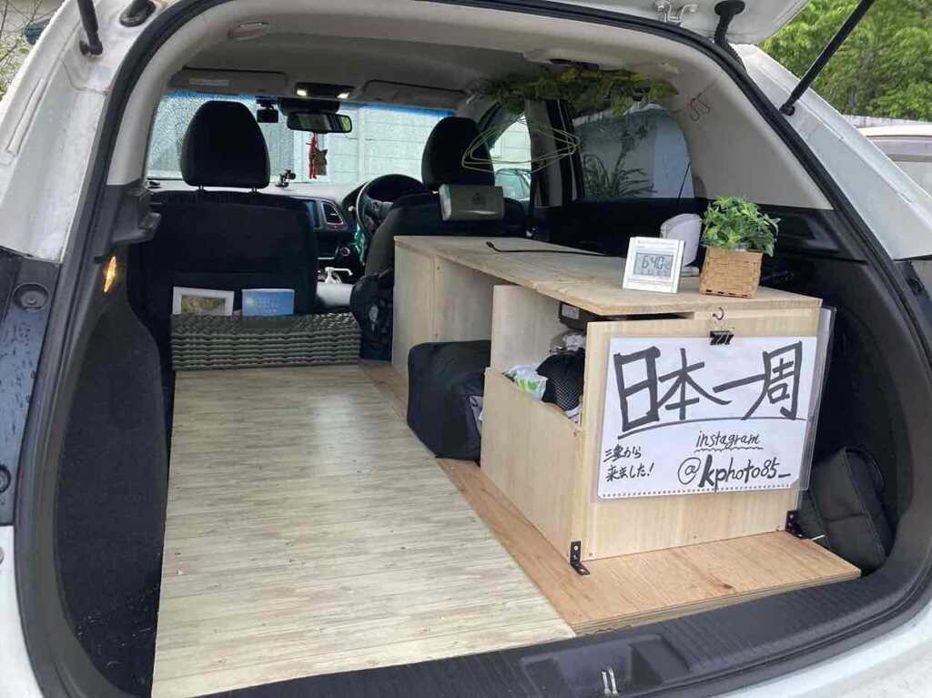 SUVだけど、後部座席を倒すとフラットになる構造だったので、自作で板を敷き、棚や小さなテーブルもDIY。